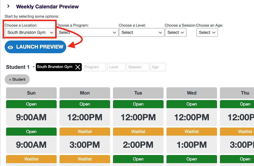- The calendar needs an initial selection to start with. Start by selecting a location. Then click “preview”.