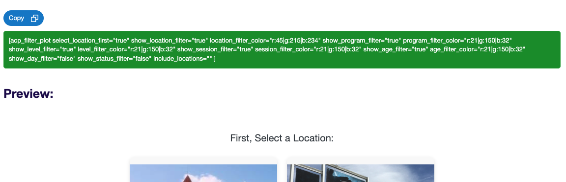 - Copy the ShortCode. There is a green section right above the preview that builds our your shortcode in realtime. Click the copy button above the shortcode and paste it into your website wherever you like.