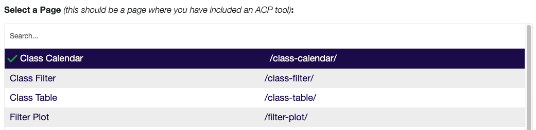 - Select a page. This should be a page where you have an ACP tool added. Just click the option in the list. It will have a green check next to it when it’s selected.